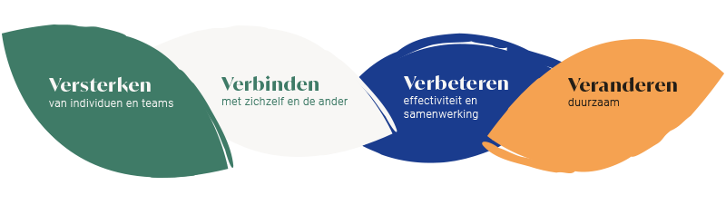 Daarnaast begeleiden we teams en leidinggevenden in het versterken van samenwerking, het verbeteren van communicatie en het realiseren van duurzame gedragsverandering, vanuit ons 4 V-model.